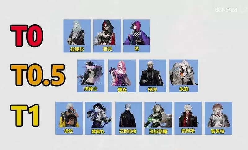 T0 拉斐尔(万金油),巨灵(up池pve优秀),朱莉,弦