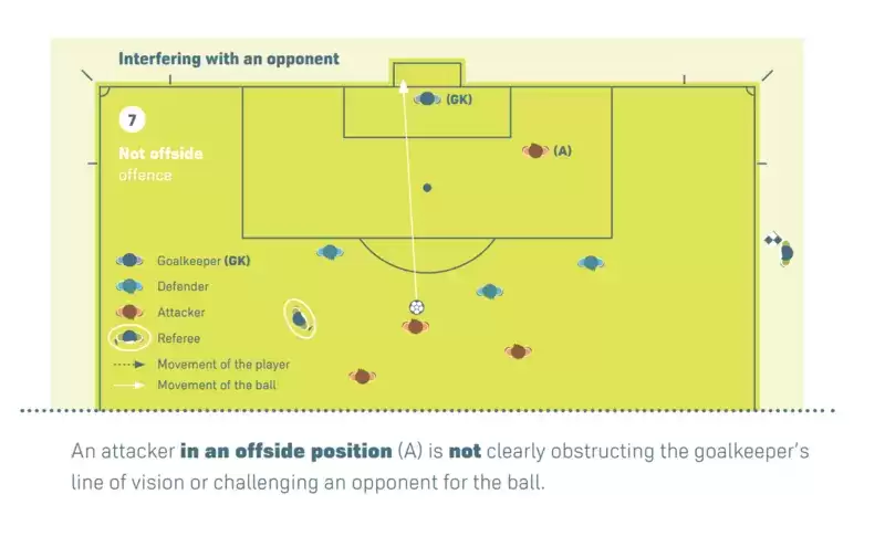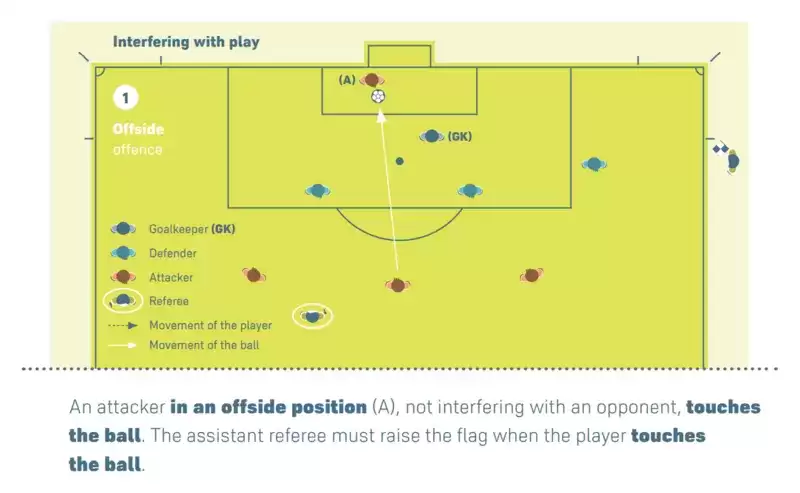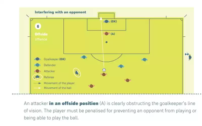 A在越位位置,没有接球,但是干扰了门将的视线,越位。