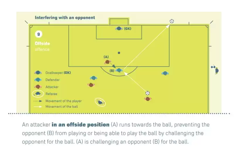 A在越位位置试图接球,但是被B破坏,B受到A的干扰,越位。