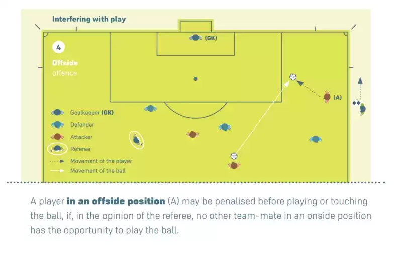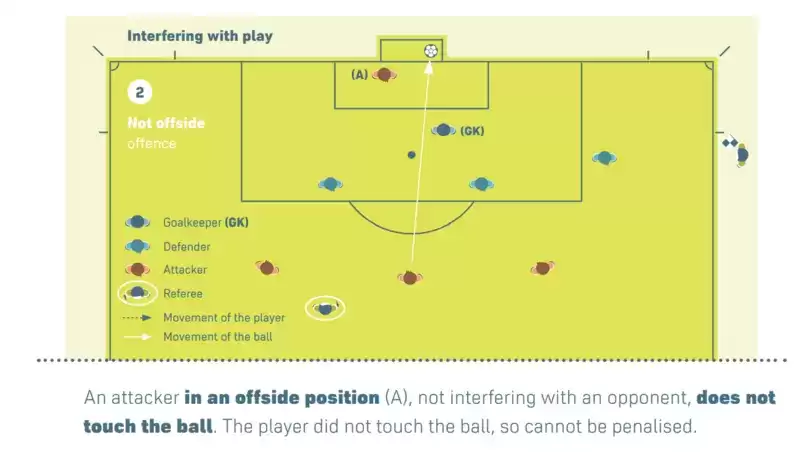 ①这张图的接球队员A在传球一刹那身后的防守队员数量为0,而且比球距离球门距离近,但是没有接到球,而且没有干扰门将,因此不是越位。