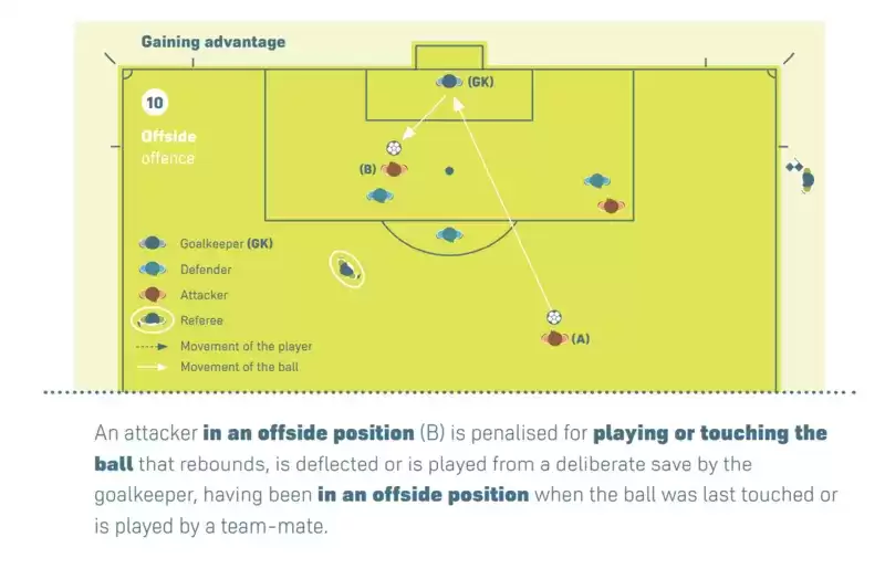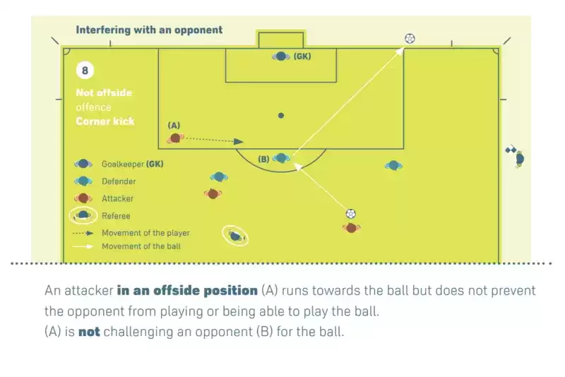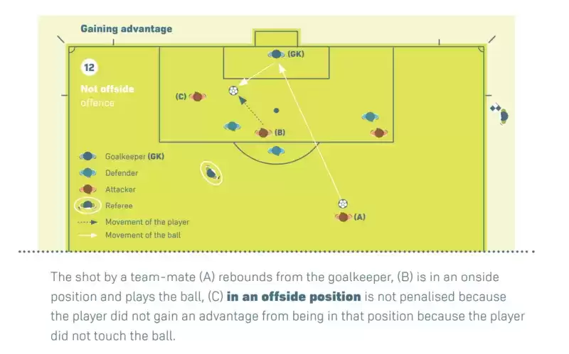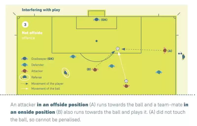 ②这张图的接球队员A处于越位位置,但是队友B去接球并且最后得球,A没有接到球,而且没有干扰门将,因此不是越位。