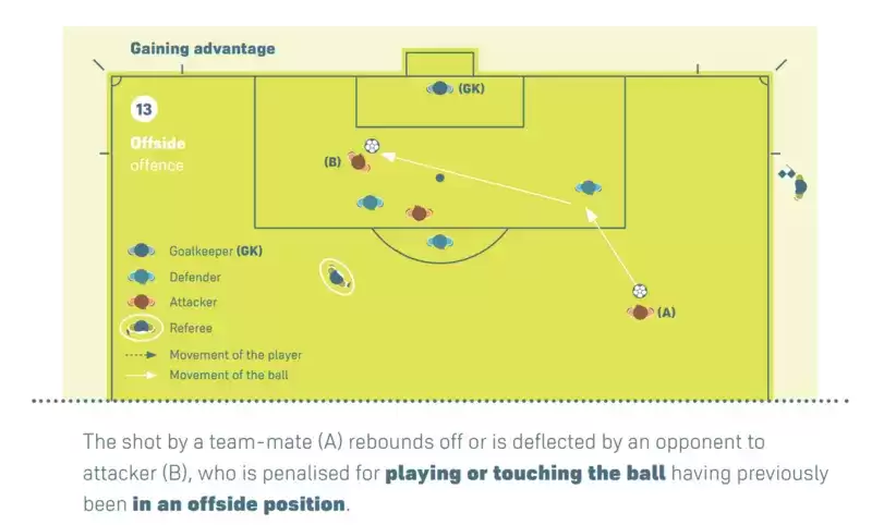 A的射门在防守方队员身上折射了一下掉到了越位位置队员B脚下,越位。