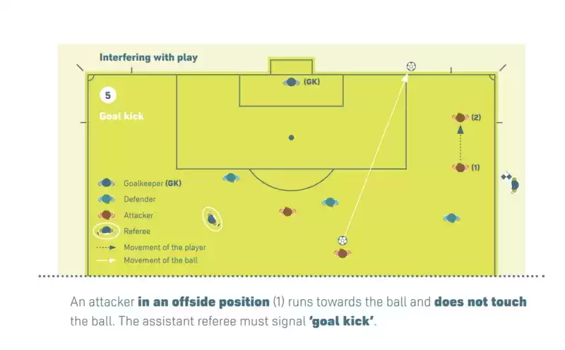 ③这张图越位位置球员A试图去接球,但是没接到,所以不是越位,而是球门球