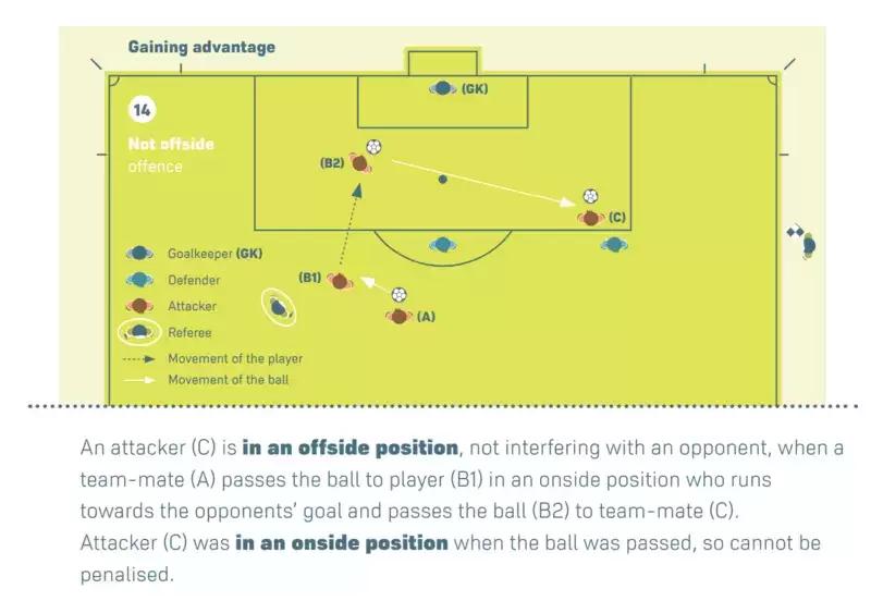 然后B从B1带球到B2,此时由于C距离端线比球远,不再处于越位位置,此时B将球传给C,不越位。