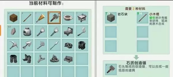 1、准备3个岩石块和4个小木棍,制作出石质创造锤。