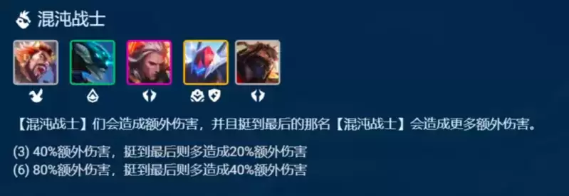 3混沌战士更是暴力,直接增加混沌战士们40%的额外伤害,且活到最后的混沌战士能在增加20%额外伤害。如果阵容只有泰隆三星,泰隆也最少能增加65%的额外伤害,搭配珠光或无尽一个技能可稳定秒后排C位。