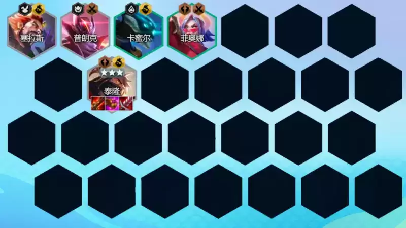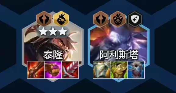 这套阵容的核心就是泰隆,其技能是可跳跃攻击到距离棋盘中心最远的敌方棋子,造成较高伤害,也就是说开启技能对敌方后排C位棋子可造成毁灭性打击。另一方面技能造成击杀还能回复生命值,续航能力较强。