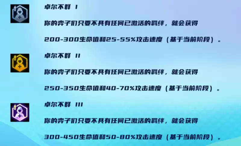 新赛季卓尔不群这个符文依然被保留了下来,还是增加无羁绊的棋子的血量与攻速,这赛季能C且比较吃攻速的棋子较多,在阵容强度上比上赛季的上限会高出许多。