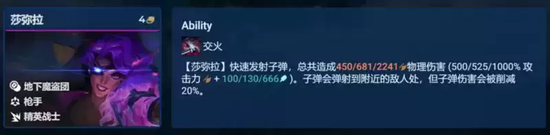 沙弥拉是纯物理输出,金色与彩色卓尔不群下可获得较高攻速,搭配技能的高物理伤害,输出会非常暴力,是4费棋子中与卓尔最契合的棋子。也是这套阵容的绝对输出核心。