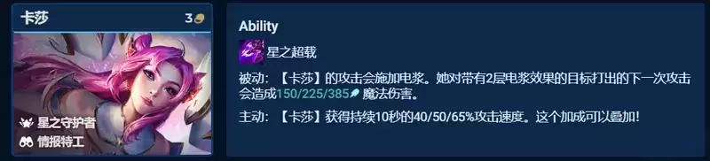 阵容中还有一个可C棋子就是卡莎,其技能可较大增加攻速还能叠加,搭配卓尔不群攻速叠加会非常快,且其是3费卡2星会比较快,是厄运小姐没来之前的完美替换,如果有鬼索也可可充当法系主C。