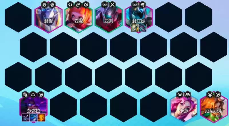 这套阵容的核心主要是沙弥拉、厄运小姐与瑟庄妮这三枚棋子。