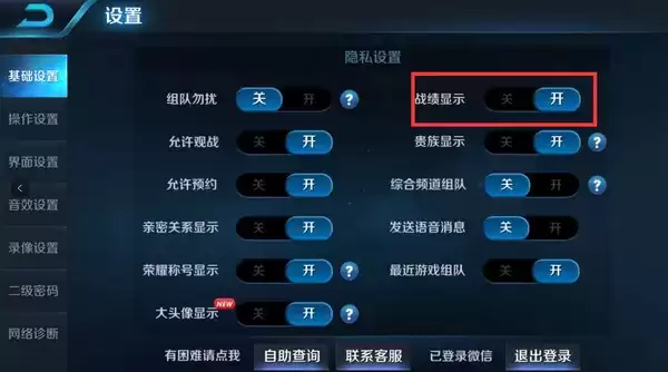 2、来到设置页面,点击左上方的【基础设置】按钮,找到【战绩显示】功能。