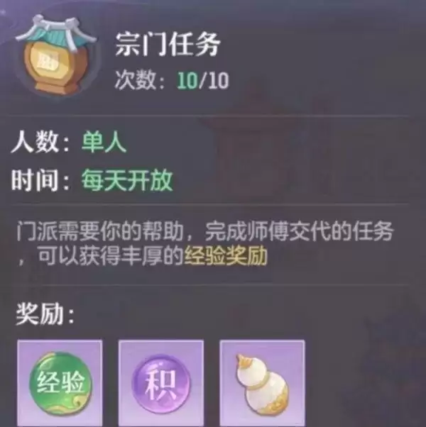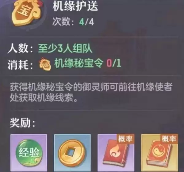 这个任务是单人任务,然而宗门任务*首要的是完成以后会给你一个一条龙任务的道具名字叫做(机遇秘宝令)这是用来完成机遇护送的道具,很首要。总共世界根基都会喊带牌子来。这个牌子即是(机遇秘宝令)。
