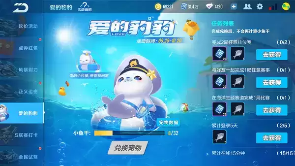 可爱的小海豹目前可在活动“爱的抱抱”中获得,活动期间完成每日任务累积获得32个小鱼干即可免费兑换宠物,喜欢的小伙伴快行动起来吧!