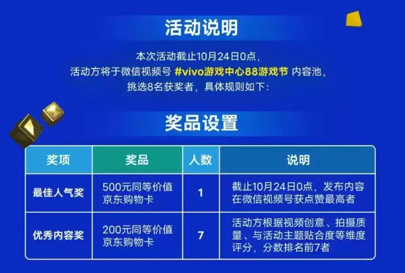 线下赛事精彩纷呈,线上互动同样精彩。vivo游戏中心88游戏节也在线上带来游戏节主题馆活动,通过线上打卡、抽手机大奖、还有赛事直播、论坛互动等不同类型的方式,为玩家送上线上福利。参与以#vivo游戏中心88游戏节#为话题在微信视频号平台的内容征集,更有“最佳人气奖”、“优秀内容奖”拿不停。