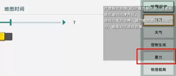 3、打开物理设置页面,把重力拉到0,再把跌落伤害关掉。