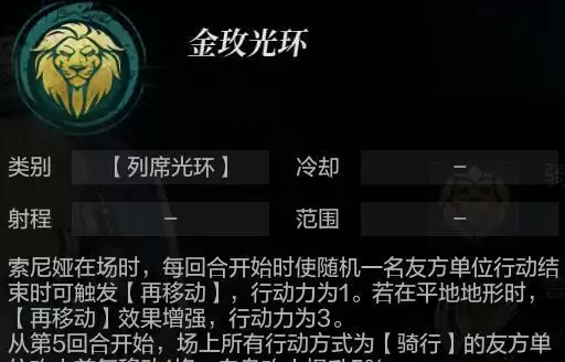 索尼娅的光环,主要在每回合,可以随机给予一名友军在行动结束时,触发再移动效果,*小移动格数为1,若在平原可以再移动3格。该效果使得友军在行动结束后,可以获得更好的移动距离,不过随机点名1名友军的机制,稳定性和实用性相对一般。
