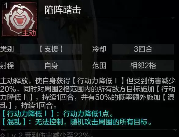 该技能偏向控制和提升自身生存,理论*佳释放时机在自身有物理护盾时、可以通过该技能的释放,限制周围两格敌军的移动,并通过护盾和减伤效果,以及概率附加的混乱效果,提升自身的扛刀频率。