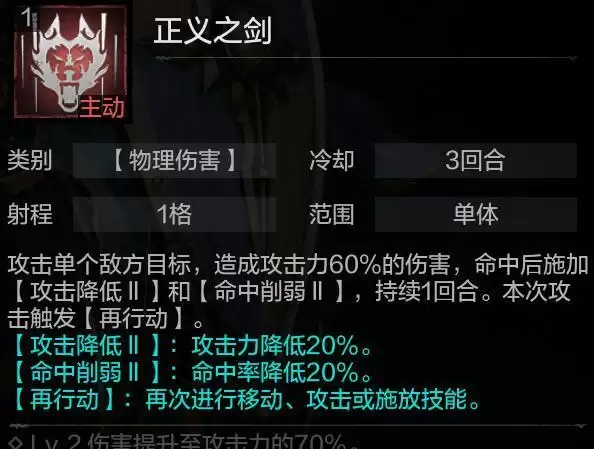 正义之剑技能本身,偏向削弱类的输出技能,技能的伤害倍率不高,但可以为目标施加降低攻击和命中率的效果。另外,该技能使用后,索尼娅可以获得一次完整的再行动轮次,能够再次进行移动、攻击或释放技能。
