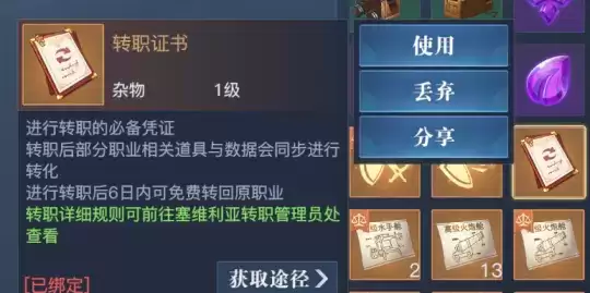 转职成功后,在背包中还会收到一个转职复原证书,这个复原证书能在7天内将职业恢复成原来的职业,如果对转职后的新职业不满意的话,就可以使用这个复原证书进行还原。