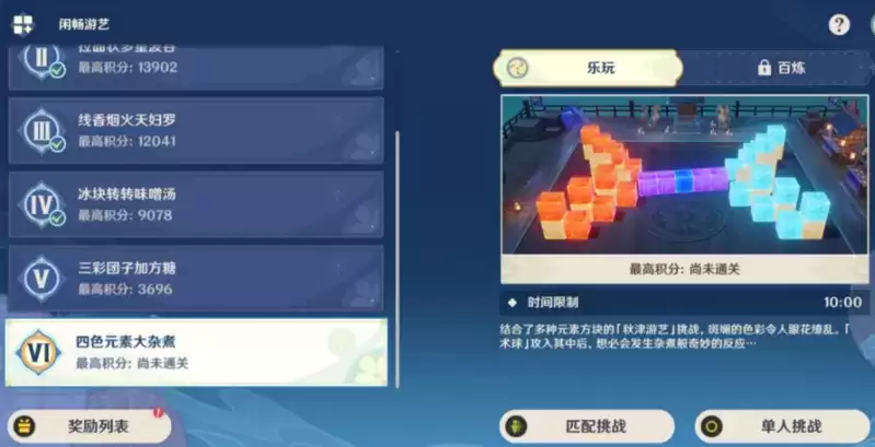 1、选择[四色元素大杂煮],匹配或单人挑战。