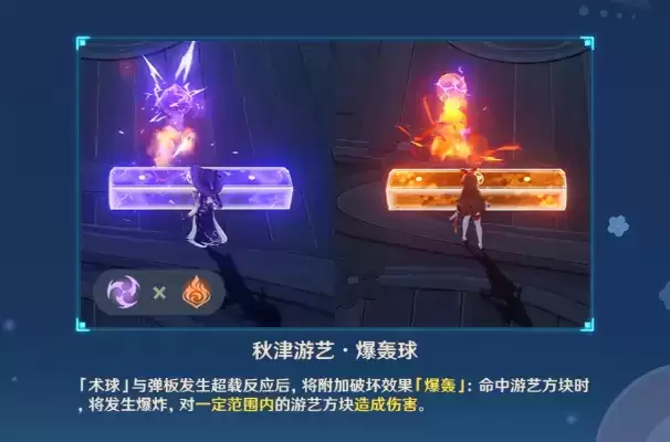 4、推荐角色:火元素/雷元素角色。术球和弹板发生超载反应后,会附加破坏效果[爆轰]。
