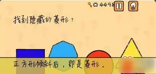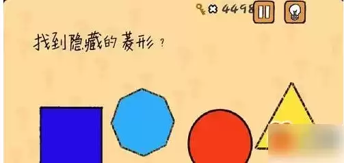 很有意思的一款游戏,既考验玩家的智力还有动手能力。如下图,我们要在正方形,8边型,原型,三角形中找到菱形!在哪呢?一起看看小编的!