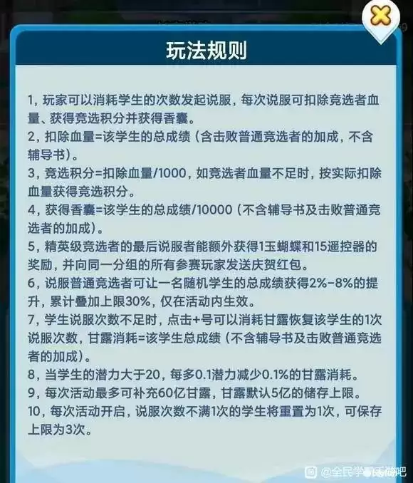 ②甘露:每次竞选消耗对应学生分数的数量(20潜力以上的学生,潜力越高甘露消耗减少百分比越高),是本活动钻石消耗的对象,最多储存5亿甘露、每次活动最多补充60亿甘露。