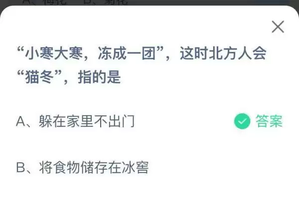 2023支付宝蚂蚁庄园1月5日的题目已经更新了,今天的题目为:小寒大寒冻成一团这时北方人会猫冬指的是?躲在家里不出门还是将食物储存在冰窖?正确答案是什么,可能很多小伙伴可能还不太清楚。下面小编就为大家带来了正确答案分享,希望能帮助到你。