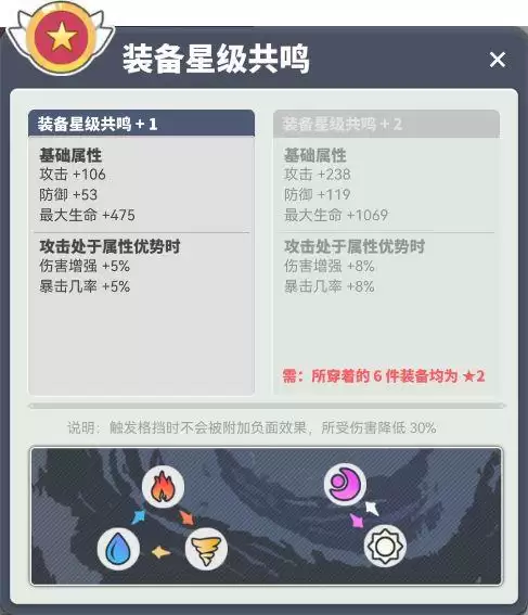 另外,打开包裹,在右边的使魔属性信息下方,装备栏上方,有1个装备星级共鸣图标,点进去就会弹出装备星级共鸣的信息了。如下图所示,目前的装备星级共鸣+1,而要令装备星级共鸣+2,需要所穿着的6件装备均为2星,即那句红字提示。