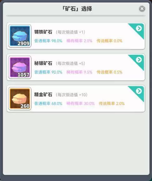 锡铁矿石(每次锻造值+1)普通概率98.0%、稀有概率2.0%、传说概率0.0%