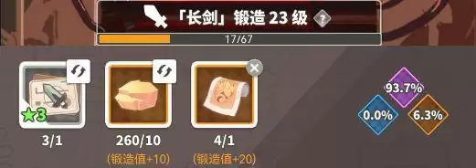 举个实例来看一下哦,上图中长剑的锻造等级为23,选择了精金矿石,并且添加了传说幸运铭文,其锻造出传说装备的概率为6.3%。让我们来核算一下,