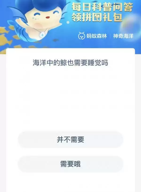 2023支付宝蚂蚁海洋1月7日的题目已经更新了,今天的题目为:海洋中的鲸也需要睡觉吗?并不需要还是需要哦?可能很多小伙伴可能还不太清楚正确答案是什么。下面小编就为大家带来了正确答案分享,希望能帮助到你。