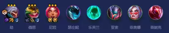 前期正常拉人口,存钱吃利息,能连胜最好,也可连败去拿鸟盾,3-2后拉6人口大D,D出6决斗且有多个2星能保证3阶段能赢的情况下即可停手存钱,上7后根据海克斯强化,可7人口追3星VN,尼菈,亚索,主养VN,也可上8D2星劫,主养劫,若有决斗转,可8人口开8决斗,决斗转给女枪,或者开6决斗上高质量5费卡都可。