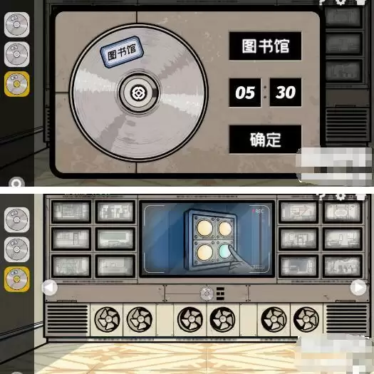 4、再使用钥匙打开光盘盒,找到图书馆的光盘,将时间调整到05:30看到校长输图书馆的密码是:左上、右下、左下、左下、右下、右上。