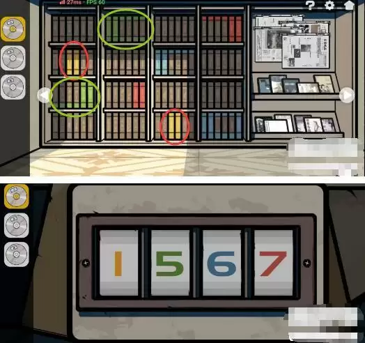 5、接着进入图书馆,根据书架上的书的颜色,将其拼接起来可以得到四个数字:黄1,红7,蓝6,绿5。