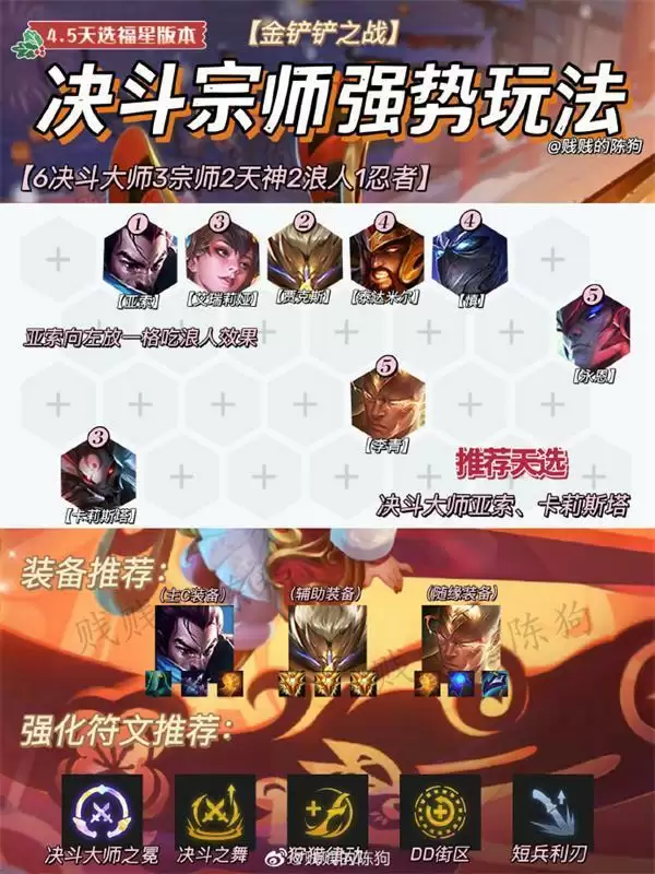 4.金铲铲之战天选福星阵容推荐四:6决斗大师3宗师2天神2浪人1忍者