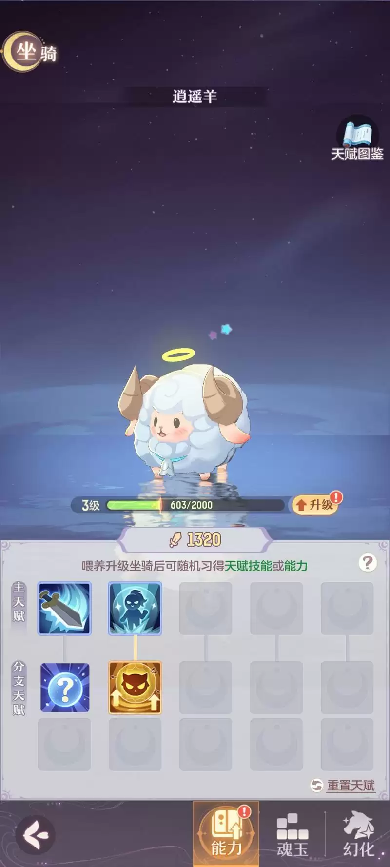 4、因为天赋比较多这里就不细说,而且给哪个天赋技能也是随机的,大家可以先看一下图鉴再升级,防止没选到好用的。后期天赋可以洗,但是建议等级稍微高一点再洗,洗一次需要一个兽灵玉佩,而前面多买的玉佩也不会浪费。
