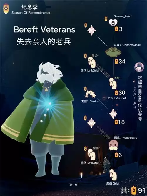 光遇失孤老兵的故事超级惨,作为一位失去儿子的老战士,他的脸上刻满了沧桑,衣服也有点老旧了。下面小编就为大家介绍下失去亲人的老兵兑换表,以及他身上的物品展示,光崽们可以提前看下。