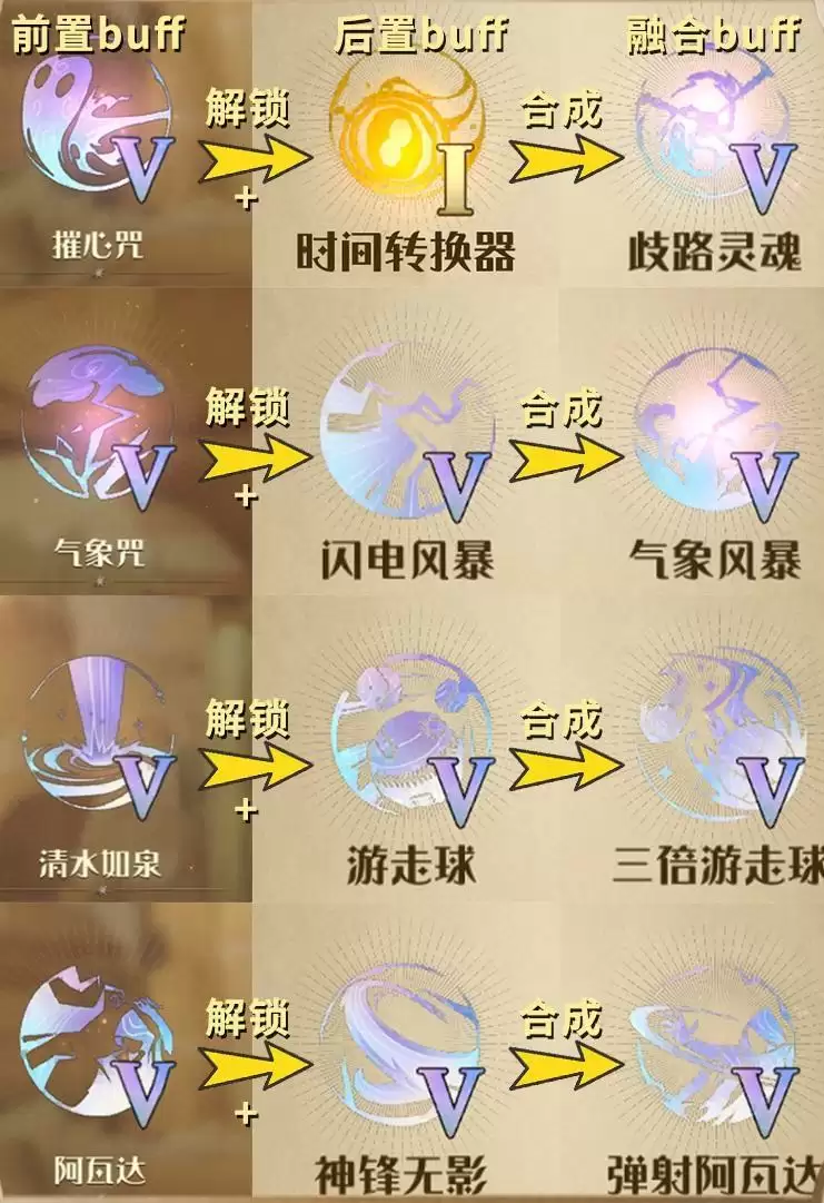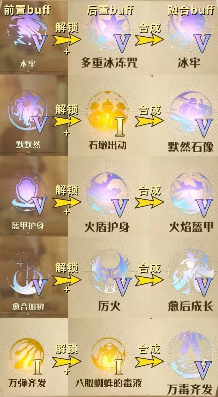 1、强力融合buff都是通过集齐前置buff就可以解锁,解锁之后拿满前置1-4级buff和1-4级后置buff,就可以拿到对应的融合buff。