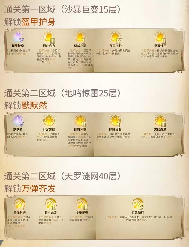 2、「盔甲护身」、「默默然」、「万弹齐发」这三个前置buff分别需要通关123区域解锁。