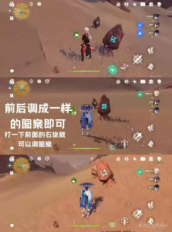 在秘境左侧可以可以看到第一只仙灵以及一个解密,仙灵碰到的石块会变换图案,我们只需要观察前后两个石块上的图案,然后通过攻击石块的方式使前后石块上的图案保持一致就可以啦