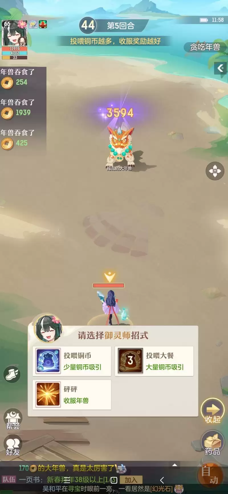 3、它这个吞金数量就是你的结算分数,影响打完后给的福袋内容,如果你直接把它打跑,福袋里的新春积分就会很低,所以一定要等大钱袋的CD,用完大钱袋再打!