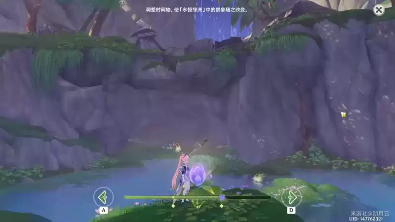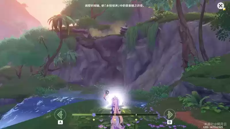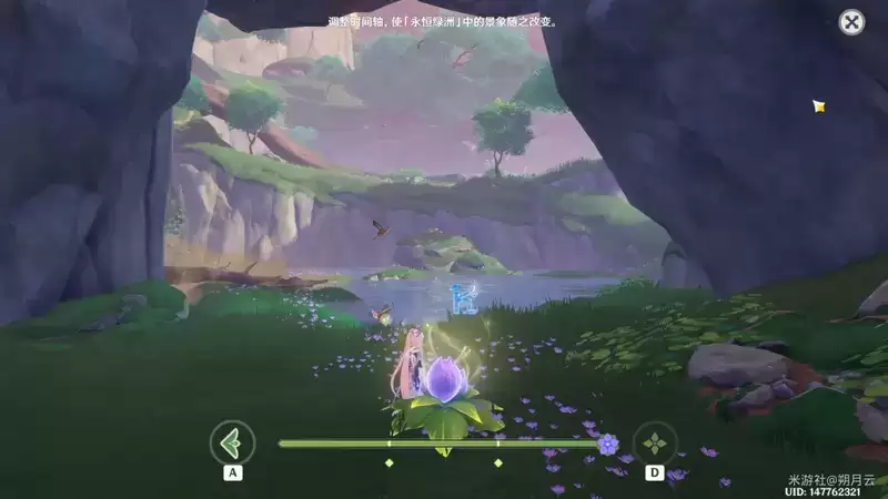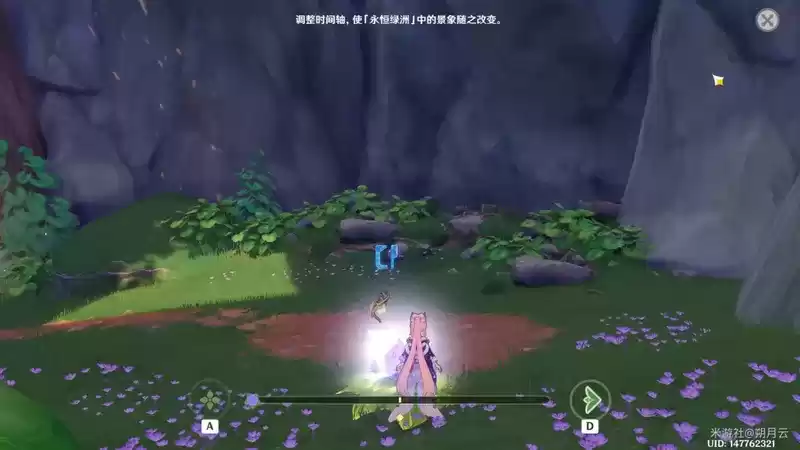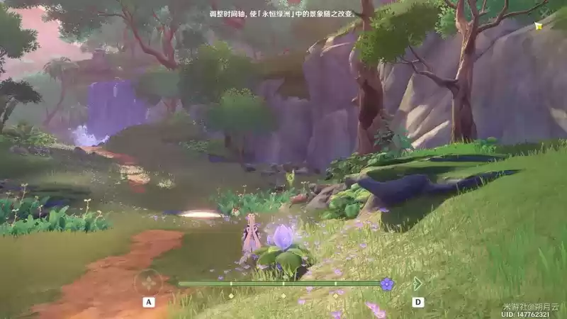 进入永恒绿洲附近的地面处有一紫色花苞,选择“接触”,跟随花苞至任务点1-1。