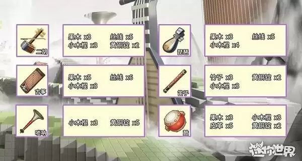 4、琵琶=果木*3+丝线*5+小木棍*4