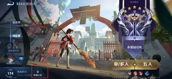 2、进入到排位赛页面,点击左下角的“荣誉记录”。