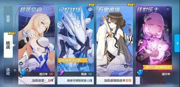 2、再点击左侧的“挑战”,选择“超弦空间”。
