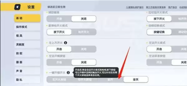 3、进入设置页面,点击左上角的“基础”功能,找到“一键开镜开火”,点击“全开”就行了。