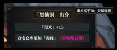 2、出身奖励:毒术+15、自宅仓库追加毒经《牵机秋石谱》。