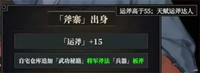 2、出身奖励:运斧+15、自宅仓库追加武功秘籍将军斧法兵器板斧。